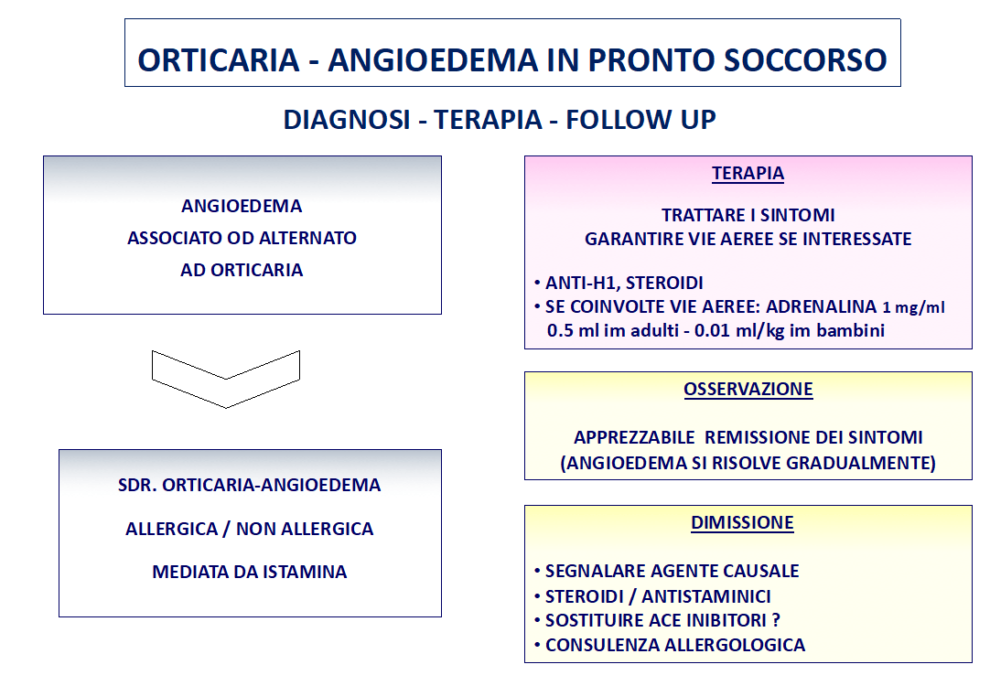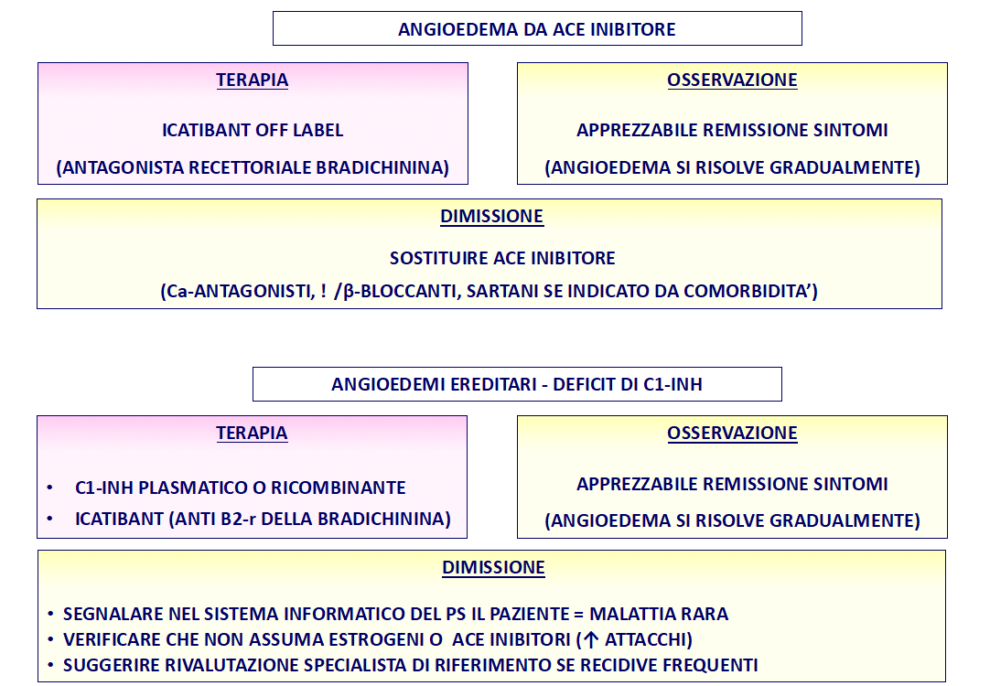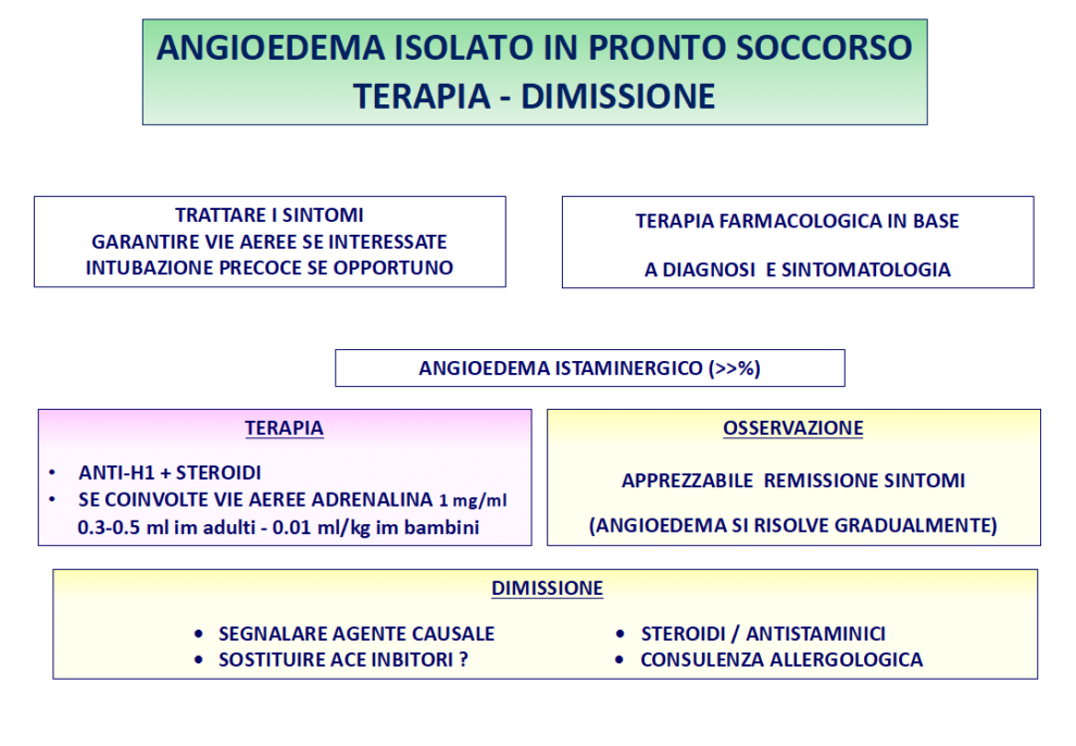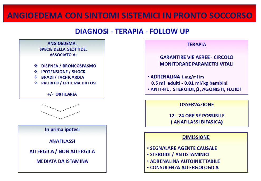 Qualora l’angioedema insorga in corso di anafilassi è invece appropriato mantenere il paziente più a lungo in O.B.I. per la possibilità di un andamento bifasico con recidiva a breve termine.