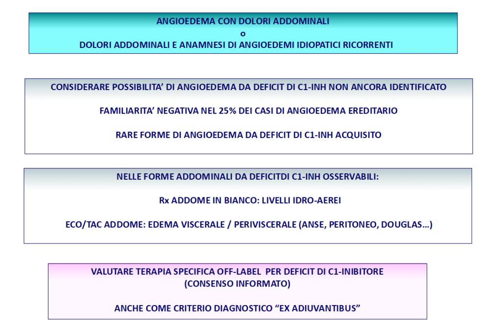 - Associazione o alternanza di angioedemi sottocutanei e coliche addominali.